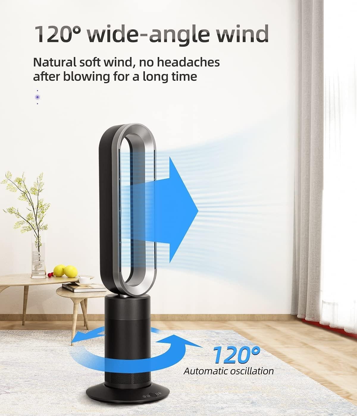 - : Very quiet in Low setting.1~9hs sleep timer. 120° wide spread Oscillation and Long-range powerful airflow. 77-86°F intelligent heating control.