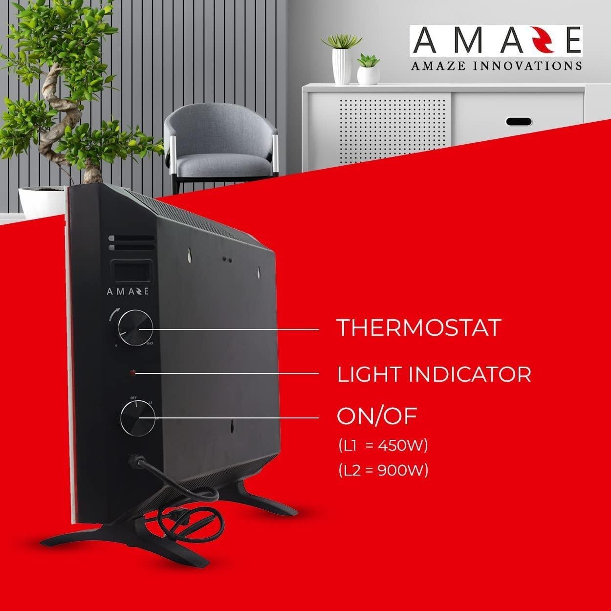 - Amaze-Heater flat panel heaters are ENERGY EFFICIENT, consuming 0.45/0.90 KW/HR and costs only 4.7/9.4 cents per hour based on average energy cost in USA. Our studies have shown that this convector space heater will lower your energy bills by as much as 50% by using the principle of zonal heating and will still keep the room with constant ambient warmth.
