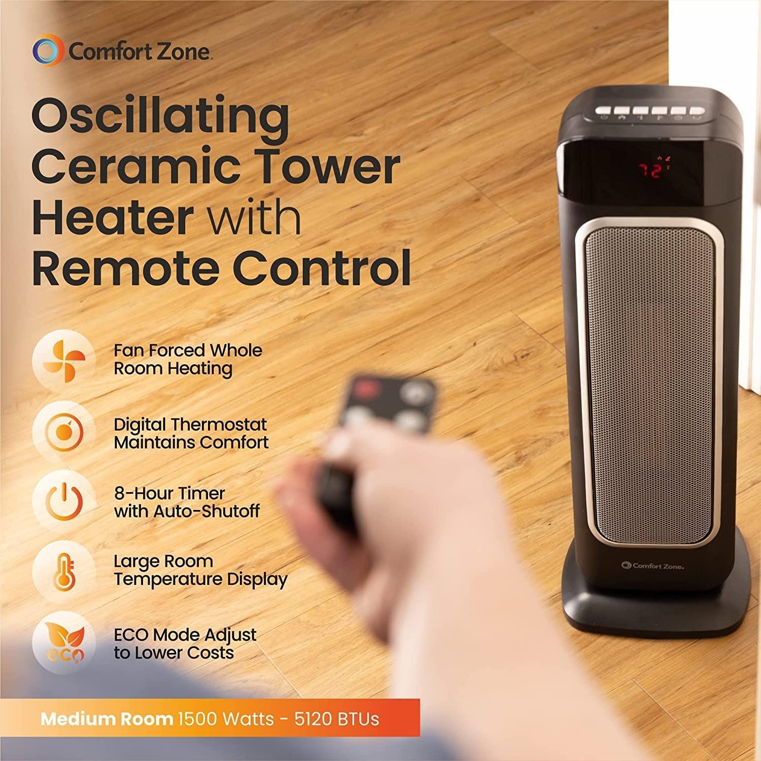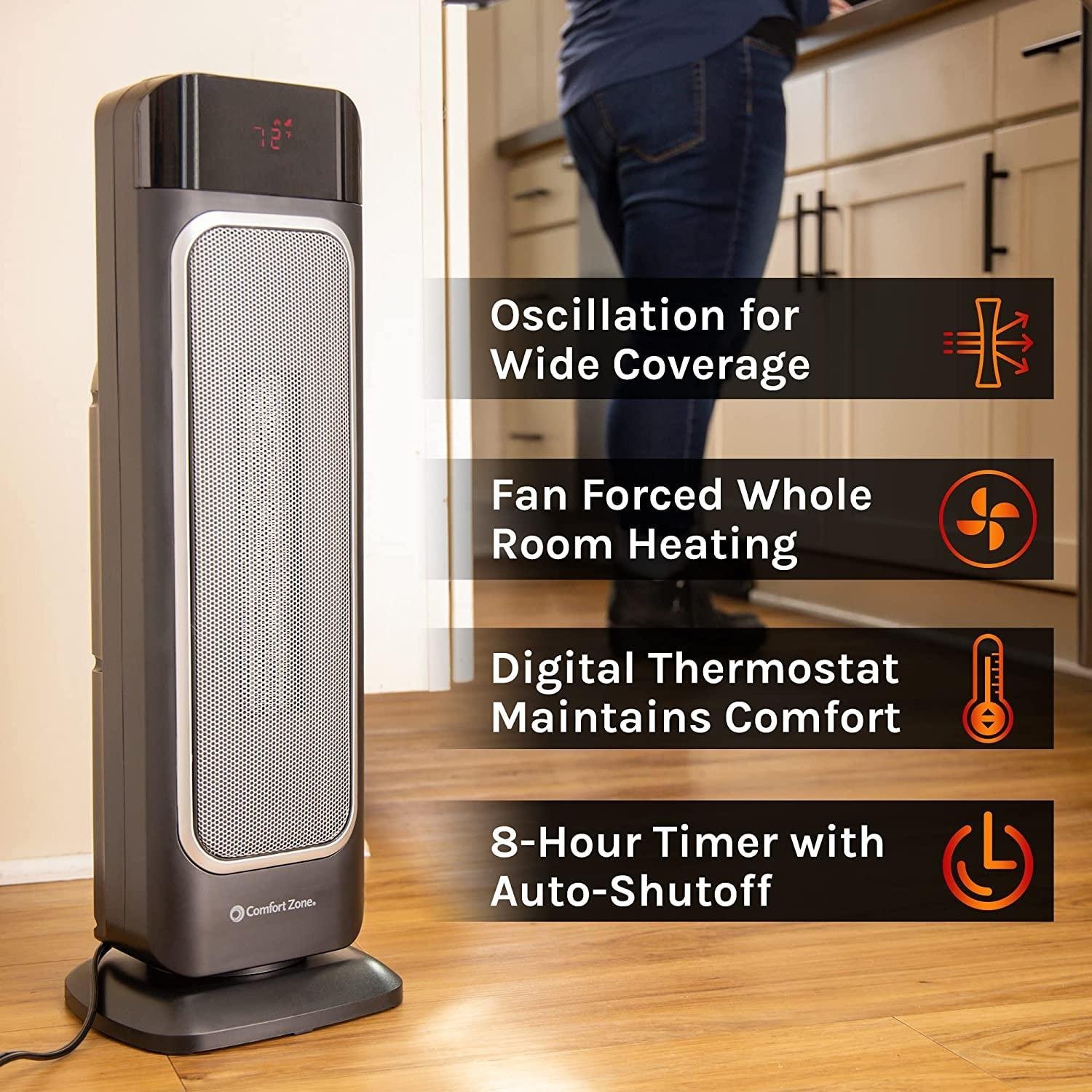 - OSCILLATING DESIGN: With a fan-forced, oscillating design, this tower heater circulates air evenly throughout the room for comfortable, whole room heating