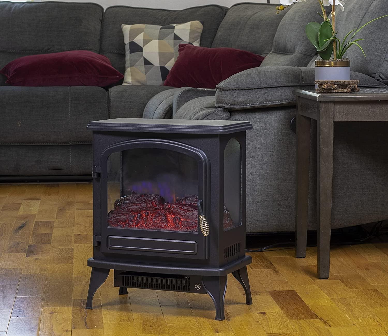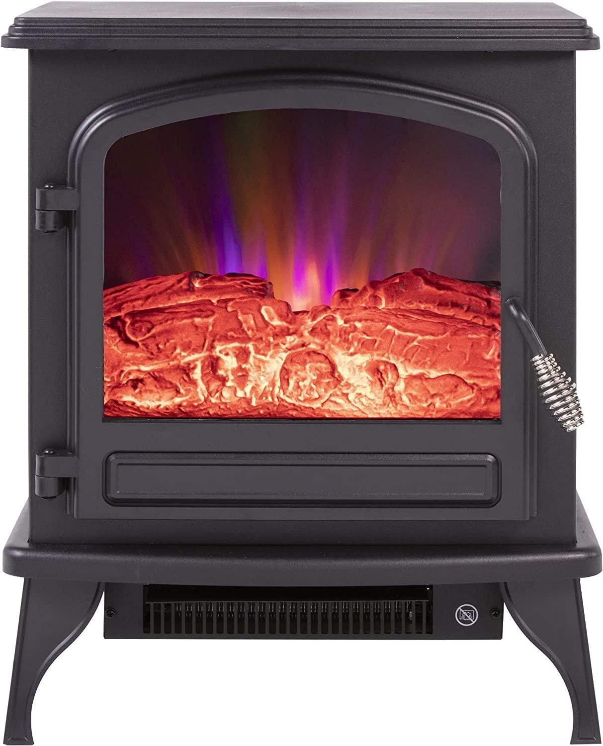 - REALISTIC FLAME EFFECT: This electric stove heater features a fireplace design with realistic LED-simulated 3D flame and ember bed for a warm, traditional look. The flame effect operates with or without heat and can be viewed through three viewing windows.