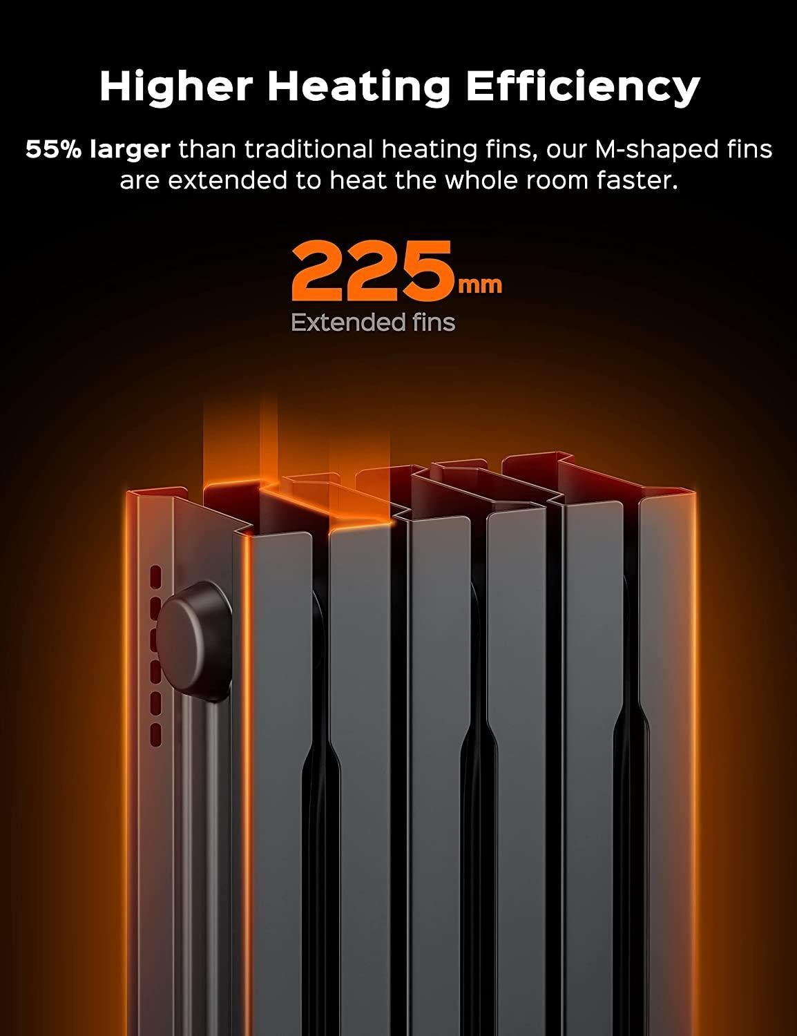 - Feel Heat Faster: The spindle-shaped openings, 225 mm larger than others enlarged fins and Dual U-shaped heating tubes make the Dreo oil radiator heater so effective in distributing heat that the heat can be doubled and released quickly, evenly and efficiently to a large area or the entire room.