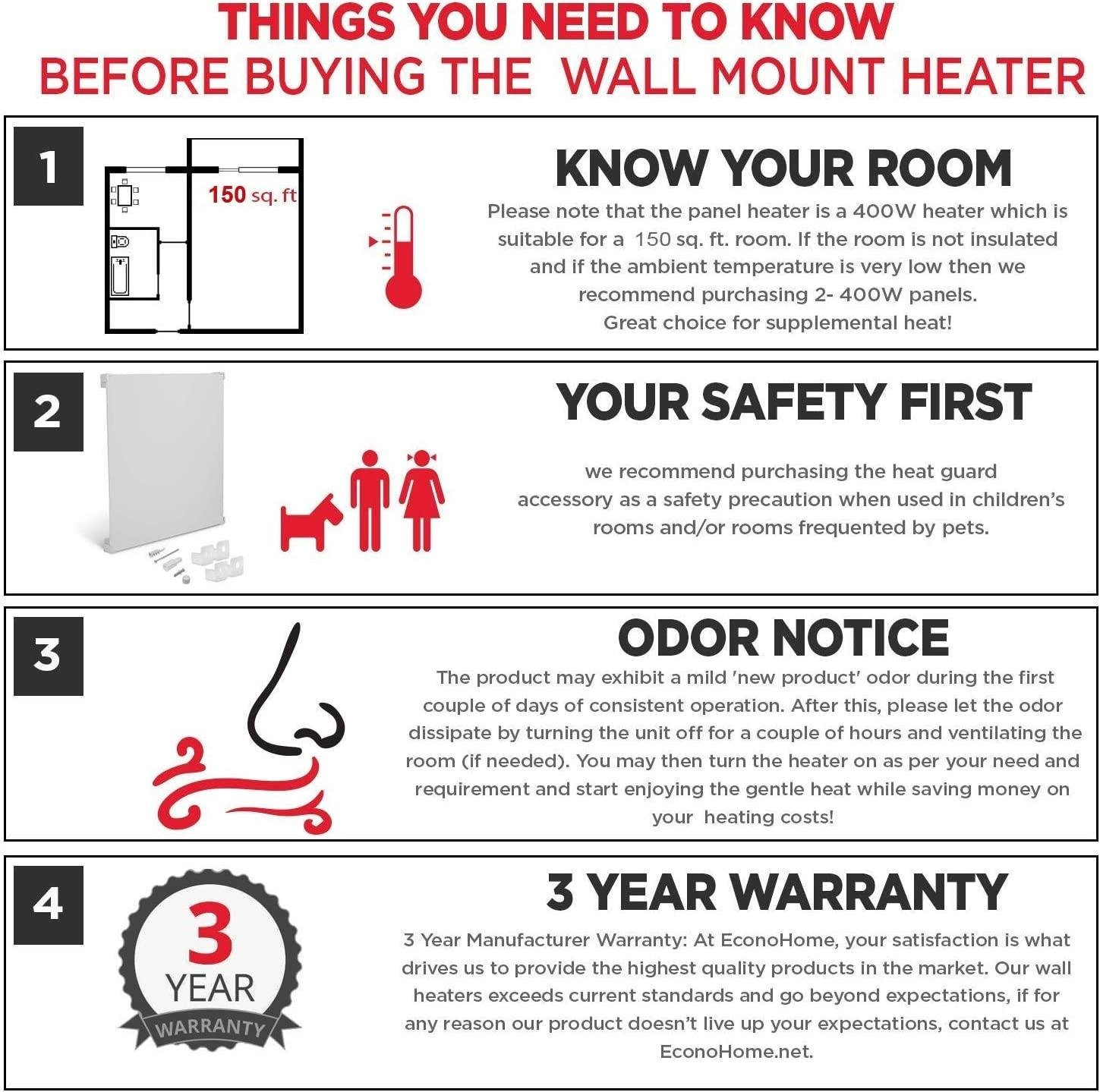 - SAFE AND EFFICIENT TECHNOLOGY: This electric wall heater operates at a constant temperature persistently. It ignites with minimal radiant heat which transmits to convection currents that rise from behind the heating panel and circulates heated air around the room. WE RECOMMEND BUYING THE HEAT GUARD ACCESSORY to go along with this heater because it doubles the efficiency of the convection currents, and its exterior casings stay warm and safe to touch.