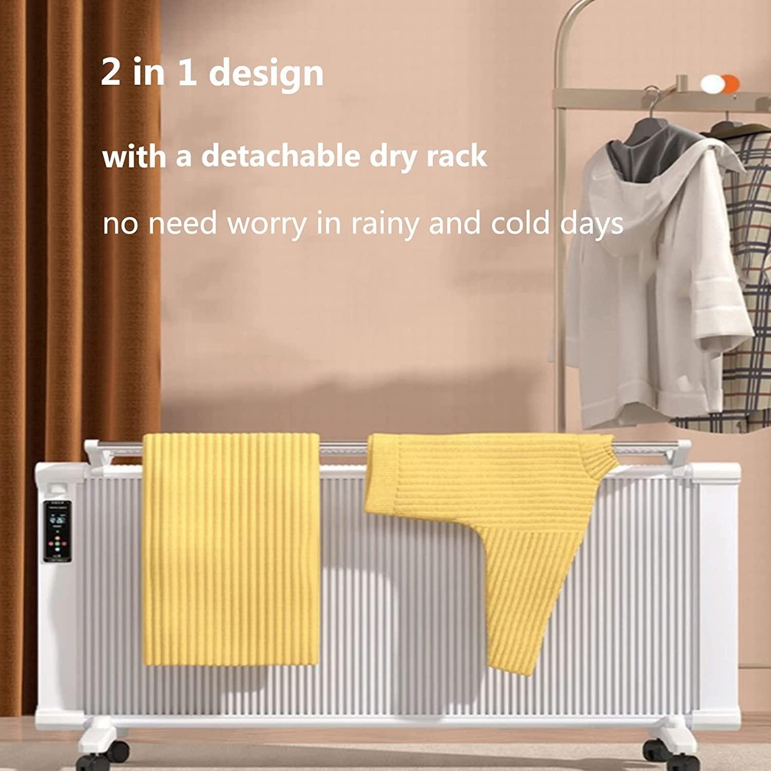 - [-stdanding or Wall-mounted]Both 2 place-methods are available. Wall-mounted way can effectively save floor space; if you sometimes need to move the heater, portable standing way is more convenient. and it comes with a detachable dry rack, 2 in 1 design, there’s no need to worry about cold or rainy days.