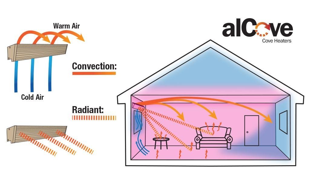 The alCove or KCV Series cove heater provides warmth from above. A space-saving radiant heater that also produces convection heat by heating the air similar to a baseboard. By combining the quick comfort of radiant heat along with the sustained warmth of convection heat, warm air is uniformly dispersed throughout the room. The cove heater is mounted near the ceiling, eliminating furniture placement problems. Surface temperatures are lower than baseboard or fan heaters, making a pleasant form of heat similar to older ceiling cable heating systems. With no moving parts this heater is quiet and maintenance free. Typical uses are day care centers, assisted living housing, housing developments, laundry rooms, bathrooms, bedrooms.