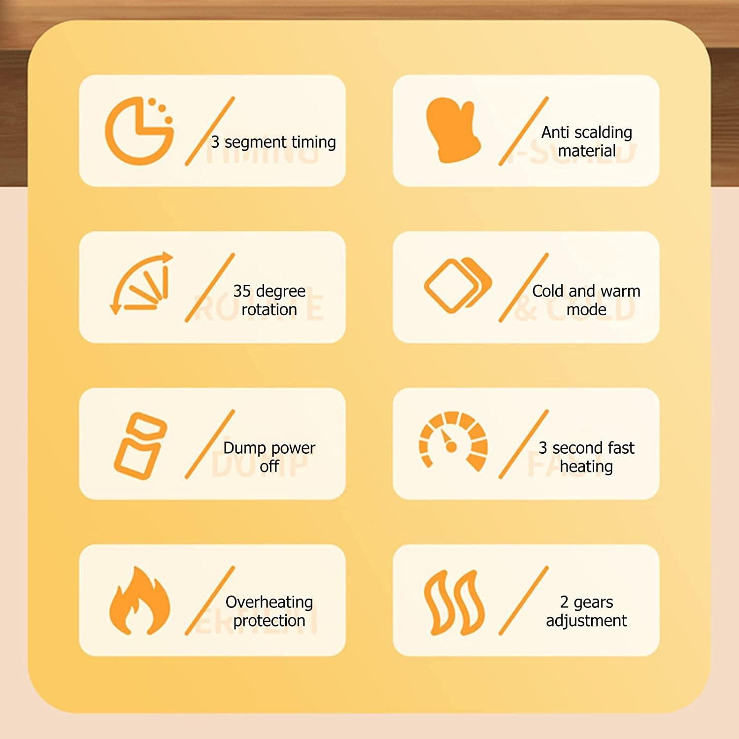 - Fast Heating: PTC ceramic heater has fast heating effect, high heat energy conversion rate, andcan achieve rapid heating in 3 second. The 35 degree wide angle rotating air supply can warm the whole house.