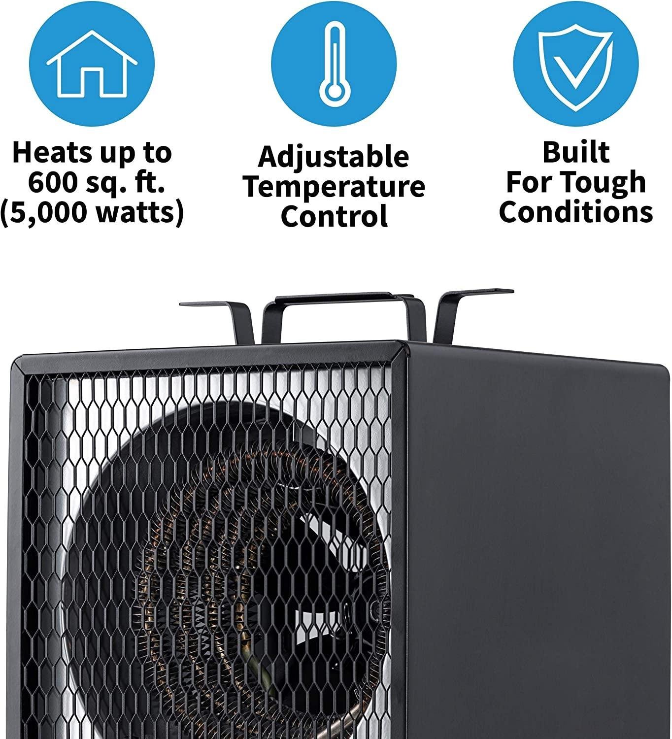 - [POWERFUL FAN FORCED HEATING] – With 5,600 watts of heating power, this electric garage heater packs a punch. It’s strong enough to warm up to 600 square feet—perfect for a two-car garage or a 24×24 workshop or shed.