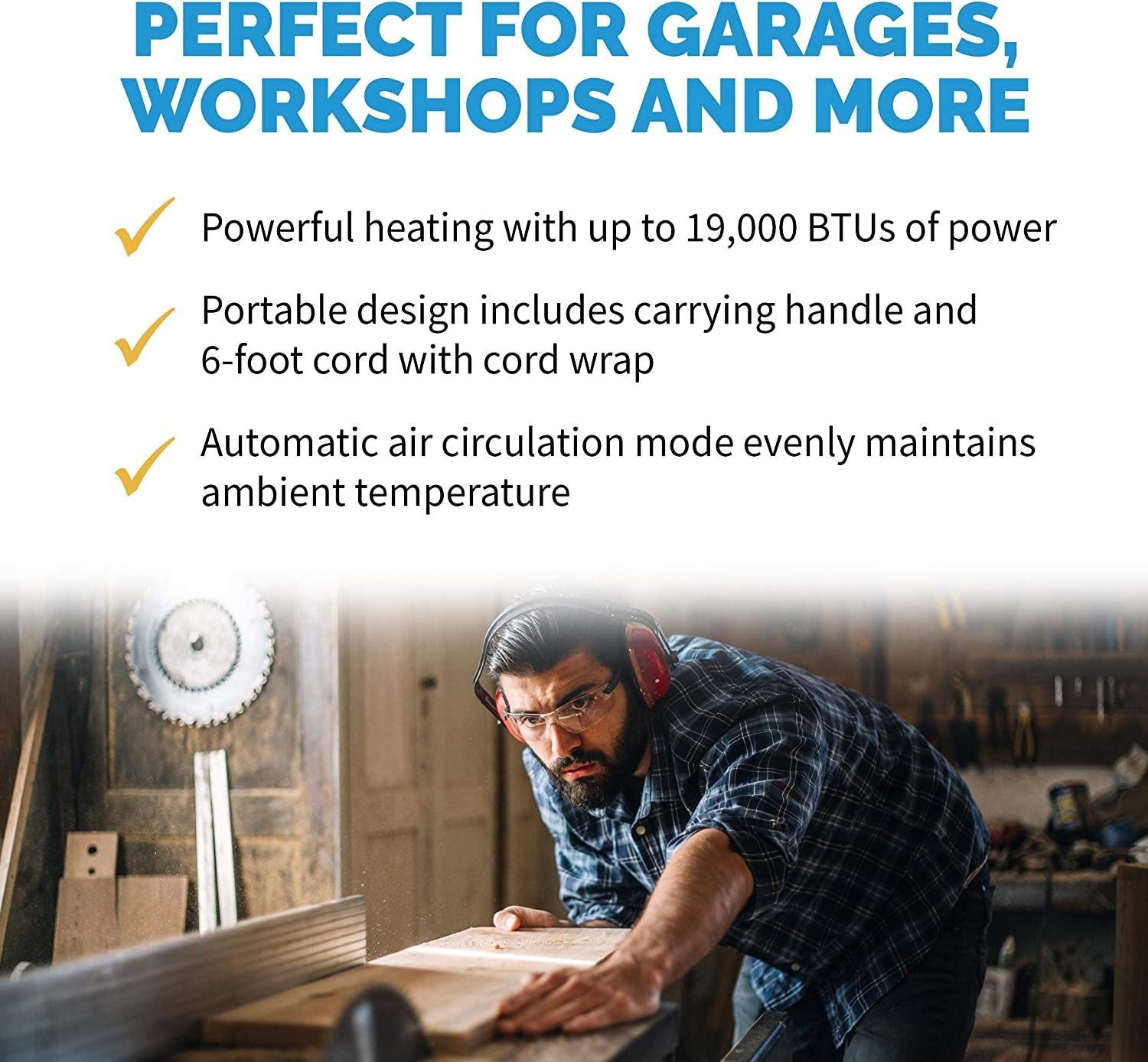 - [PORTABILITY FEATURES FOR FAR-RANGING HEAT] – Take advantage of 2 portable features: the cord wrap and carry handle. Together they make it easy for you to position or move your heater to the most ideal place in your garage, workshop, or shed.