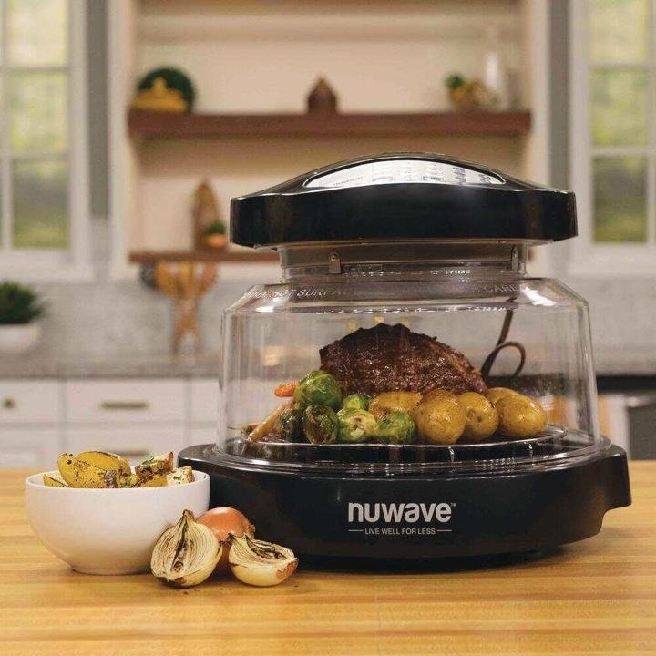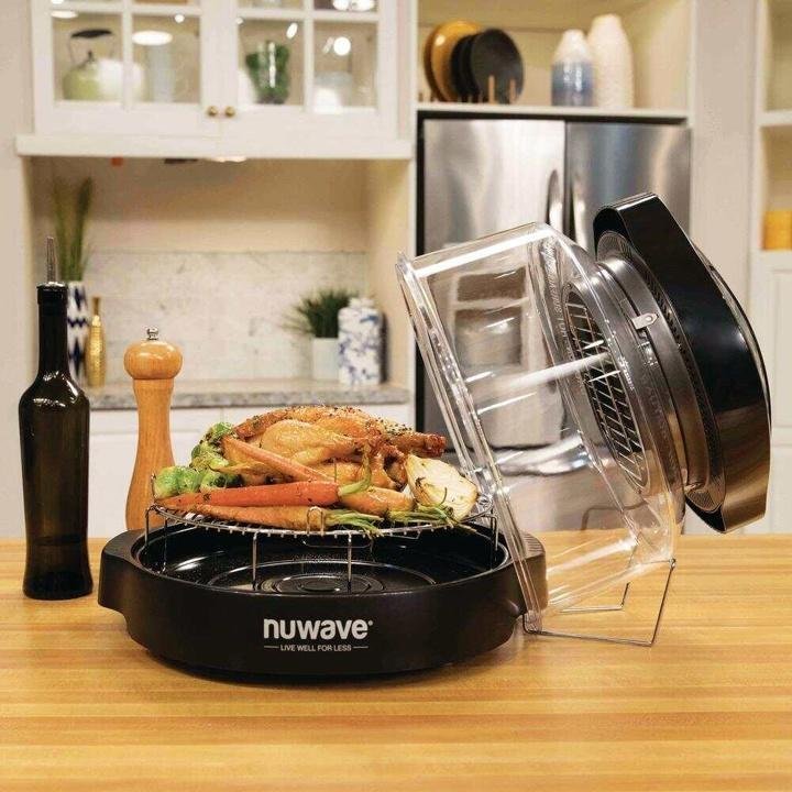 The NuWave 20631 Oven Pro takes advantage of Triple Combo Cooking Power to cook foods quickly and deliciously. It uses conduction heat, just like a conventional oven, convection heat, which circulates hot air around the food, and infrared heat, which penetrates food, cooking on the outside and inside at the same time. The NuWave Oven allows you to bake, broil, barbecue, roast, grill, steam, dehydrate, and air-fry all in one convenient appliance.