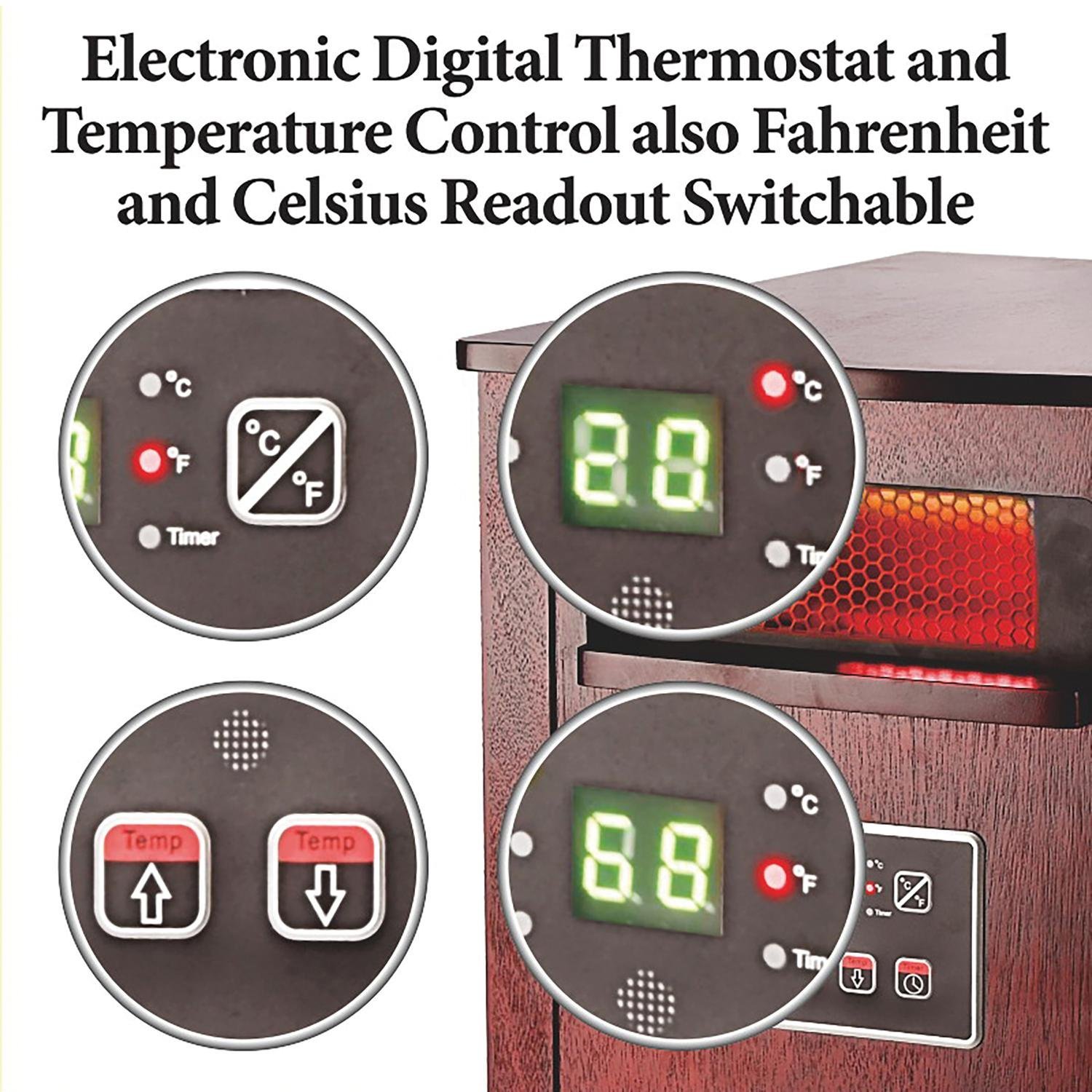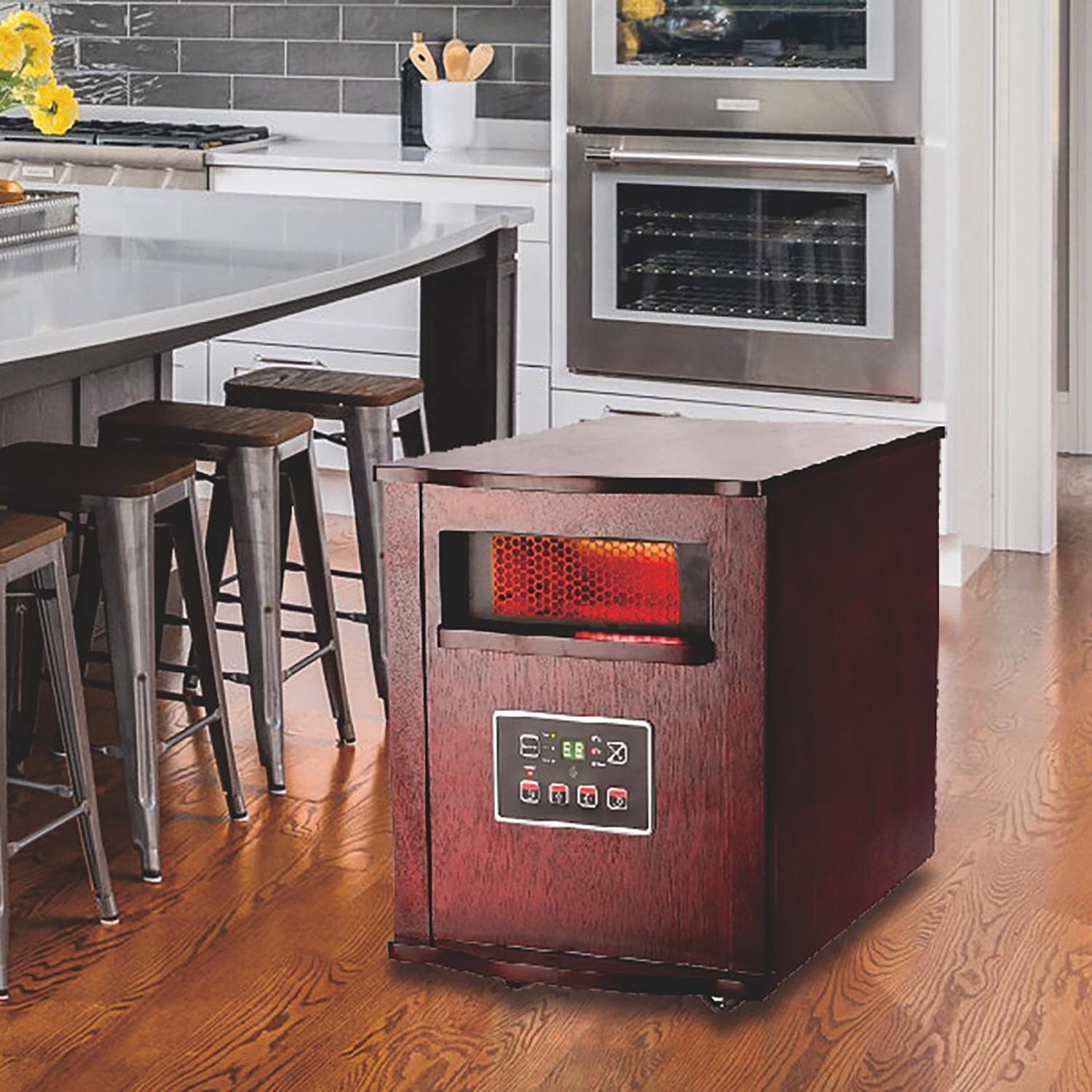 Need heat on the go? This Optimus 3-Setting 1,500-Watt-Max Portable Wood-Cabinet Infrared Quartz Heater with Remote, LED Display, and Wheeled Base is a smart, safe, and savvy way to heat up the living spaces you hibernate during the winter with soothing, comforting heat. It has a slick design so it doesn’t take up too much room and is ideal for medium or large rooms like living room, family rooms and as a heater for a bedroom. It features 2 levels of heating and an ECO setting. The overheat protection circuit and tip-over safety switch help to make sure that safety is never put on the back burner.