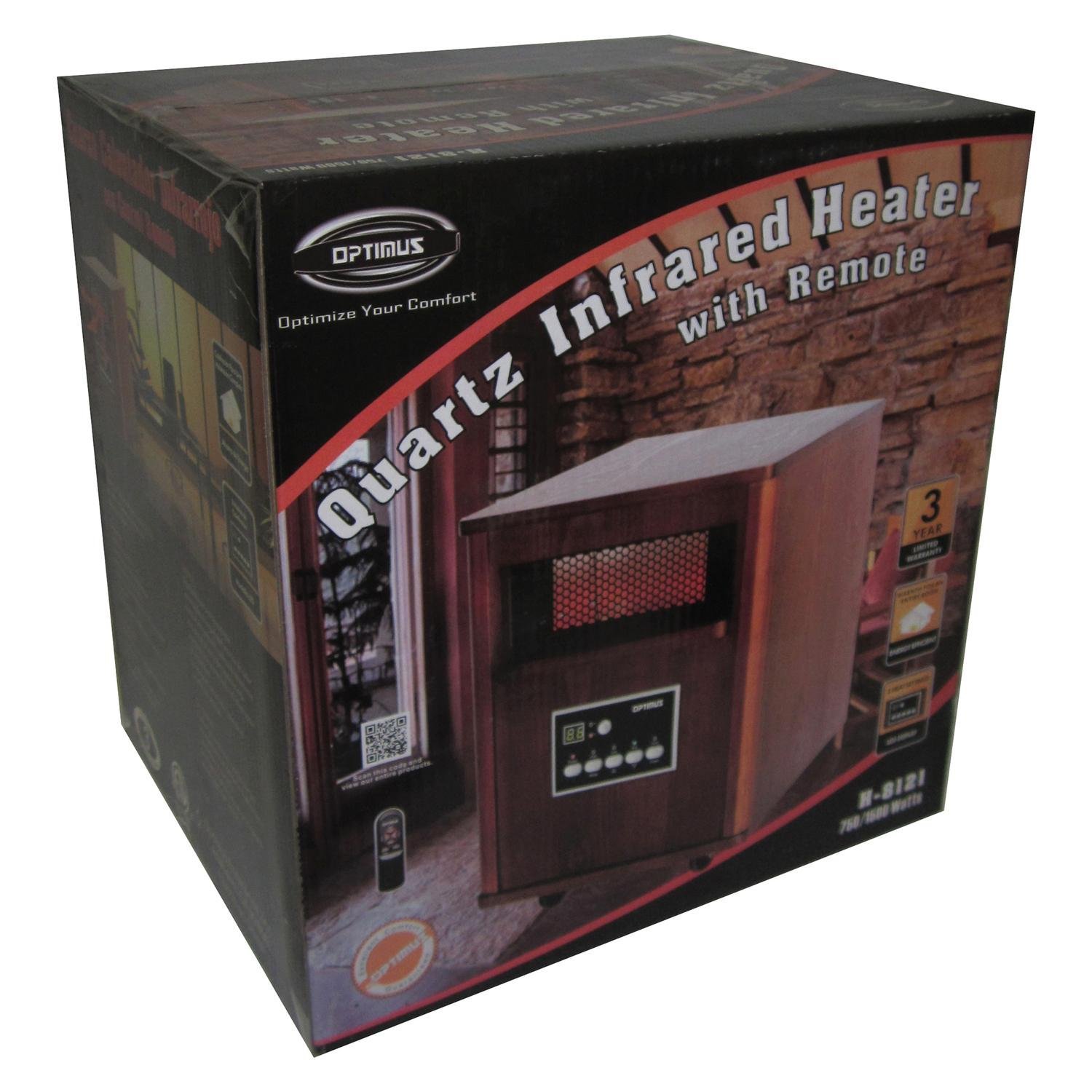 Optimus H-8121 3-Setting 1,500-Watt-Max Portable Wood-Cabinet Infrared Quartz Heater with Remote, LED Display, and Wheeled Base