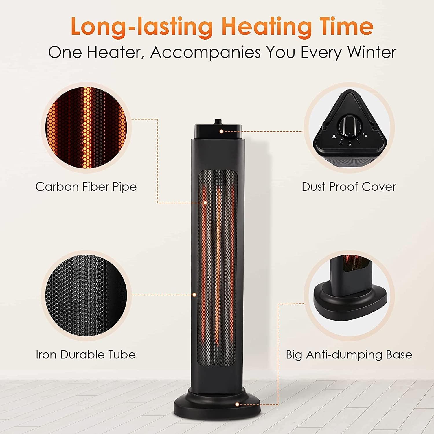 - 3s Instant Heat & 4 Adjustable Modes; Equipped with a carbon fiber heating tube and under the rated power of 1500W, the space heaters for indoor use can heat up in 3 seconds a relatively small space like a bedroom; The patio heater comes with 4 adjustable heat setting modes to your different needs: 750W, 750W+Oscillation, 1500W, 750W+Oscillation; You can simply spin the switch to get the mode you want