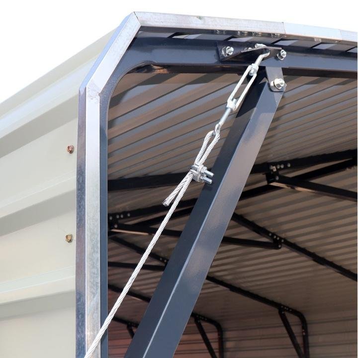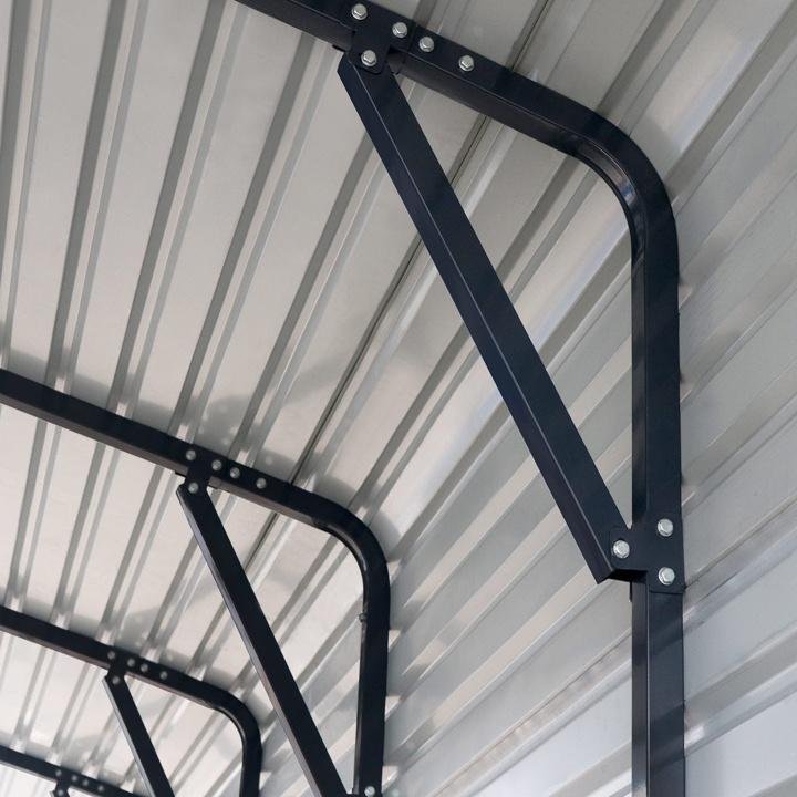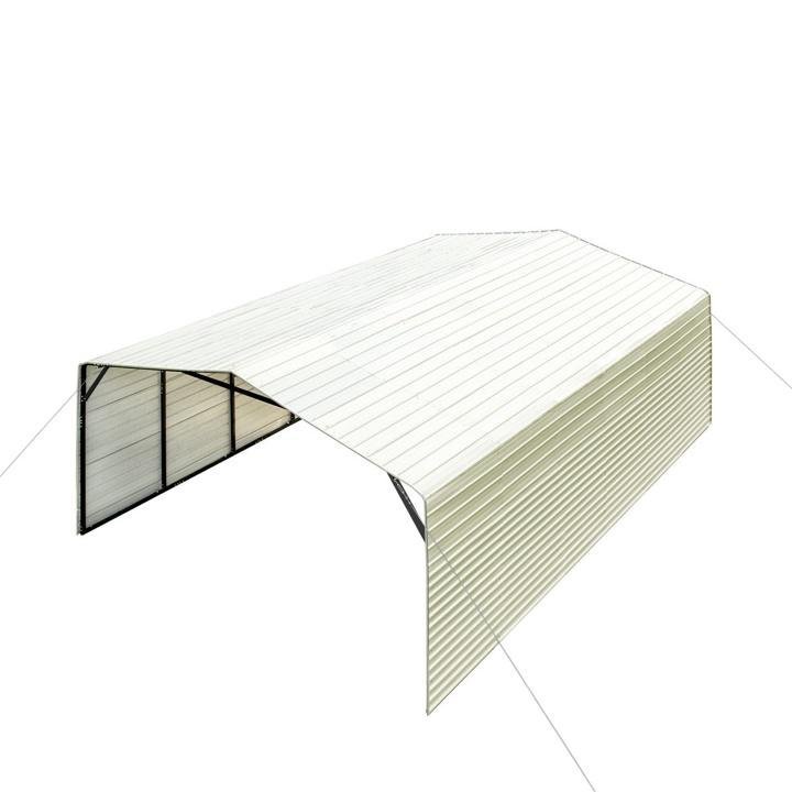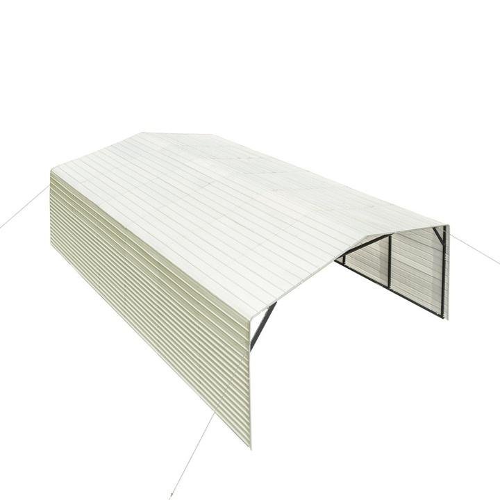 The TMG Industrial 20* x 30* All-Steel Carport Shed with an increased sidewall height of?10′?is designed to last through years of sun, wind, rain, and snow. The roof is made of 27-gauge corrugated steel that is fully galvanized and coated with cream-coloured polyester paint. A 15-gauge 2 powder-coated steel tube frame and anchor cables make this car shelter tough enough to handle 75MPH winds and a snow load of 30 PSF. The frame is easy to assembly with slip-fit connections and self-drilling screws.